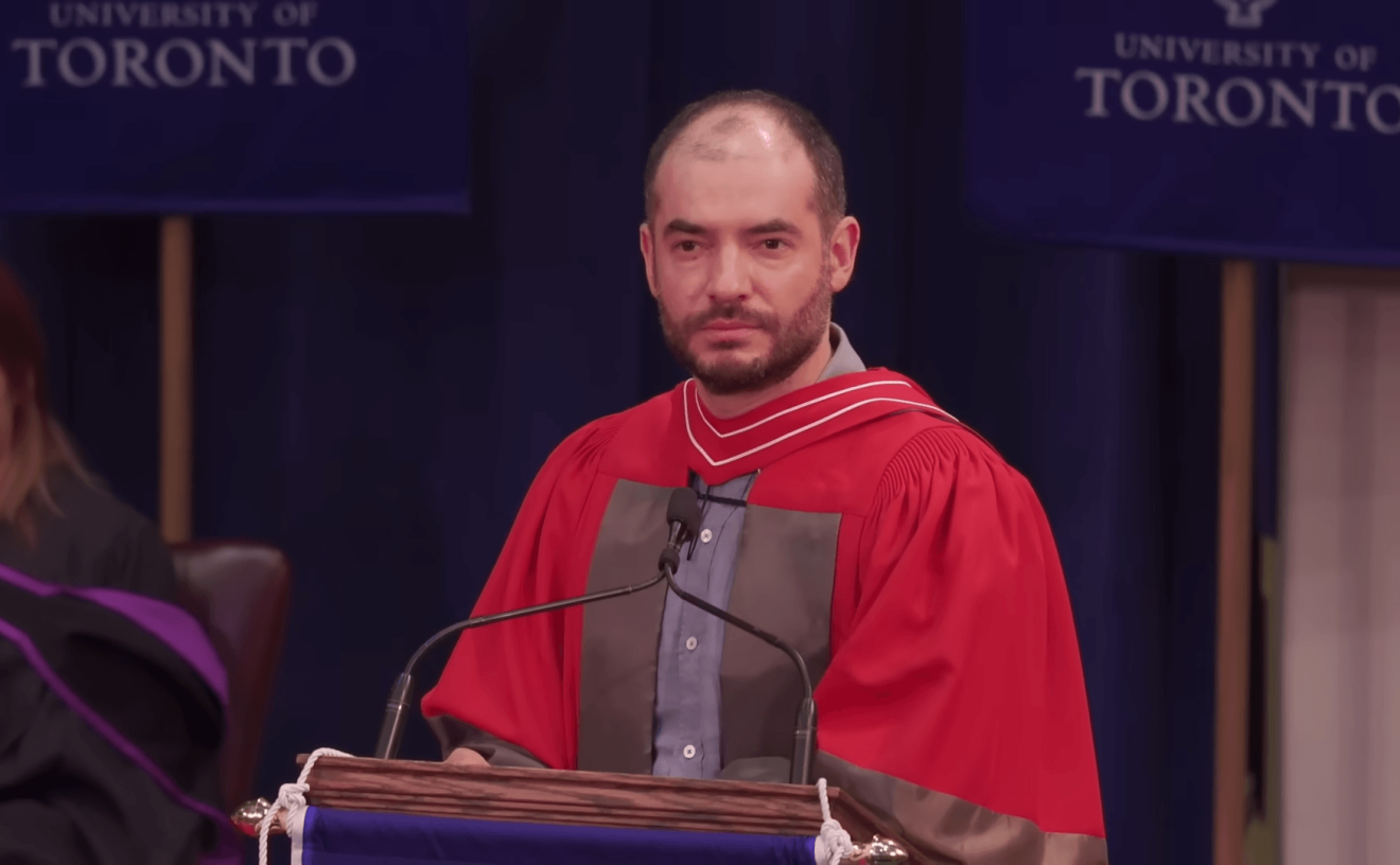 首先,我想感谢所有人组织这次活动,感谢你们授予我这个荣誉学位。这对我来说意义非凡。差不多二十年前的今天,我在多伦多大学的这个礼堂里拿到了我的学士学位。现在,我已经从这所大学获得了四个学位!在这里的时光非常美好,我在这里度过了十年,完成了本科和研究生学业,学到了很多东西。我有机会深入研究我感兴趣的领域,成长为一名研究者。能与杰夫·辛顿(Geoffrey Hinton)一起学习是我人生中的一大幸事,他的存在让这所大学对我来说更加特别。我对多伦多大学充满感恩,这里让我接受了教育、成熟成长,并成为一名科学家。