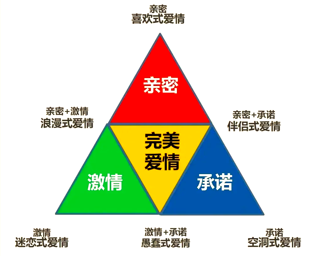 美国心理学家斯腾伯格提出的爱情三角形理论,认为爱情由三个基本成分组成:激情、亲密和承诺。