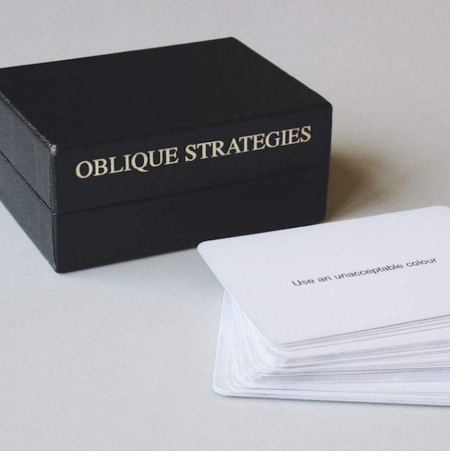 创意策略提示卡牌是一套卡片,由音乐家和艺术家Brian Eno设计,在你最需要的时候提供一点创意灵感。它启发思维伸展、生长,例如,“试着假装!”、“增加什么?减少什么?”和“不要害怕事情,因为它们很容易做”……
