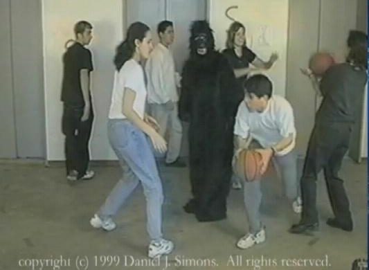 该研究的参与者被要求观看视频并计算白队篮球运动员之间发生了多少次传球。视频以适中的速度移动,跟踪传球是一项相对容易的任务。大多数人在计数时没有注意到的是,在测试过程中,一个穿着大猩猩服的男人走上球场,站在中间,然后走出屏幕。